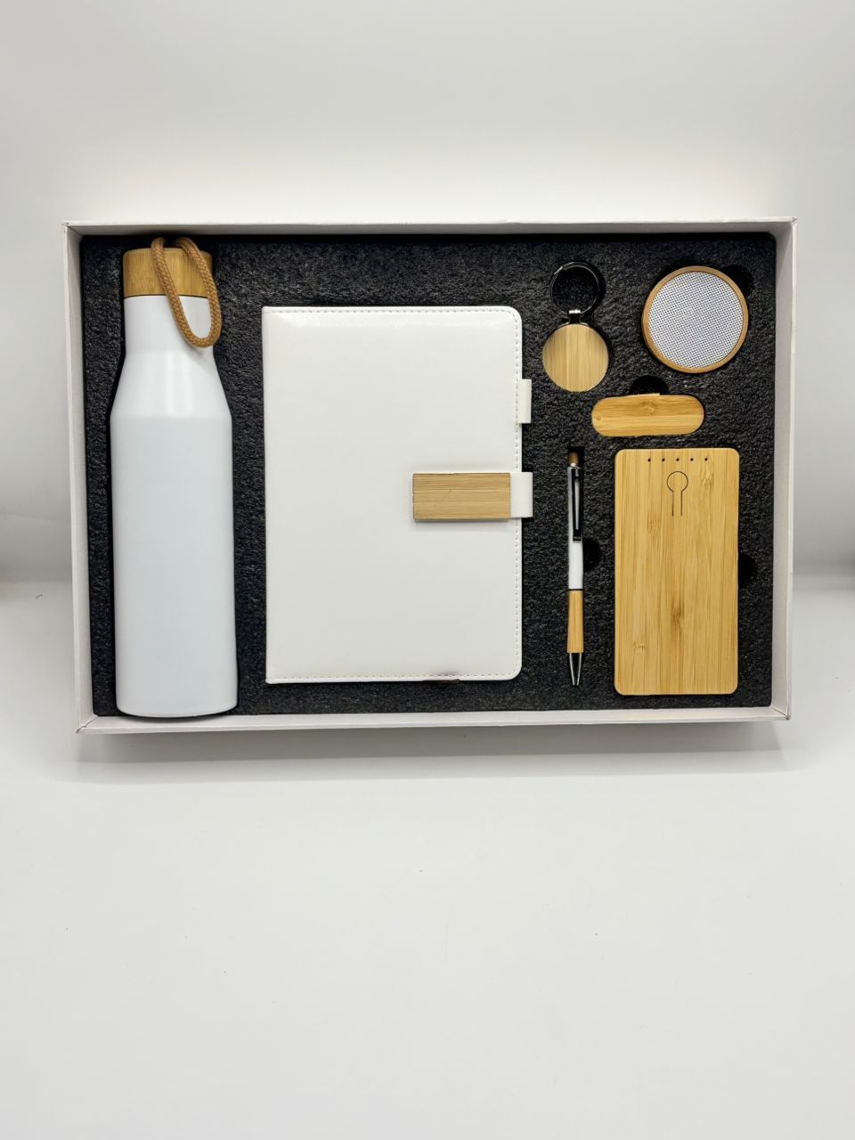 Ce coffret blanc premium est une véritable signature de style : pureté, minimalisme et sophistication. La combinaison du blanc éclatant et du bambou crée un contraste moderne qui convient parfaitement aux marques élégantes et aux événements haut standing.